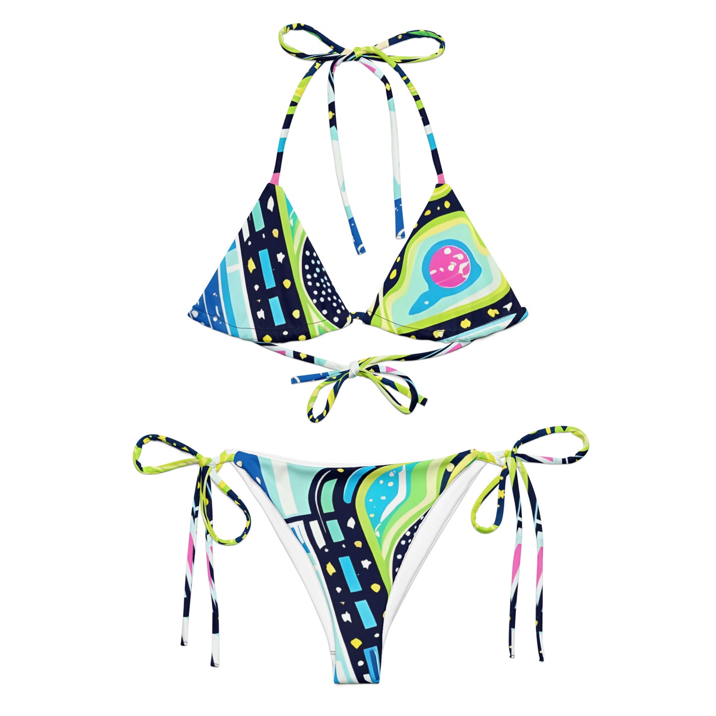 Stay comfortable and stylish all summer with this All-Over Print Recycled String Bikini set. It’s made from soft recycled polyester with double-layering and UPF 50+. Style the straps how you like, and get ready to swim!
